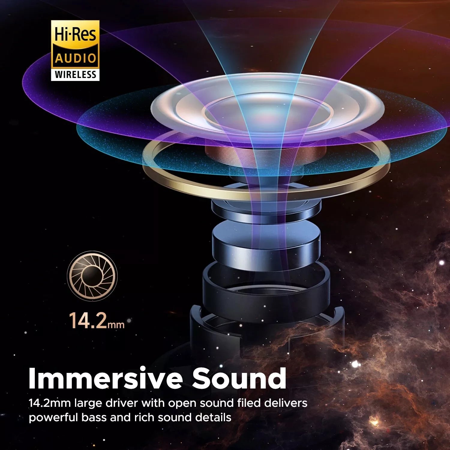 Delicate Sound; Equipped with a 14.2mm driver, the wireless earbuds delicately reproduce heavy low frequencies and clear, high-resolution midst and highs, presenting an open soundstage with detailed sound quality. You can enjoy any music style you want without effort.