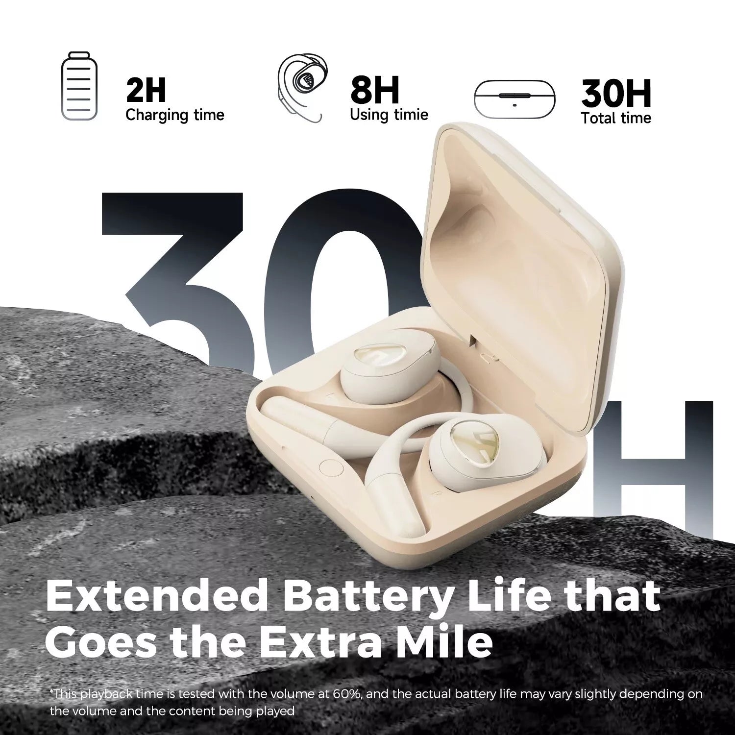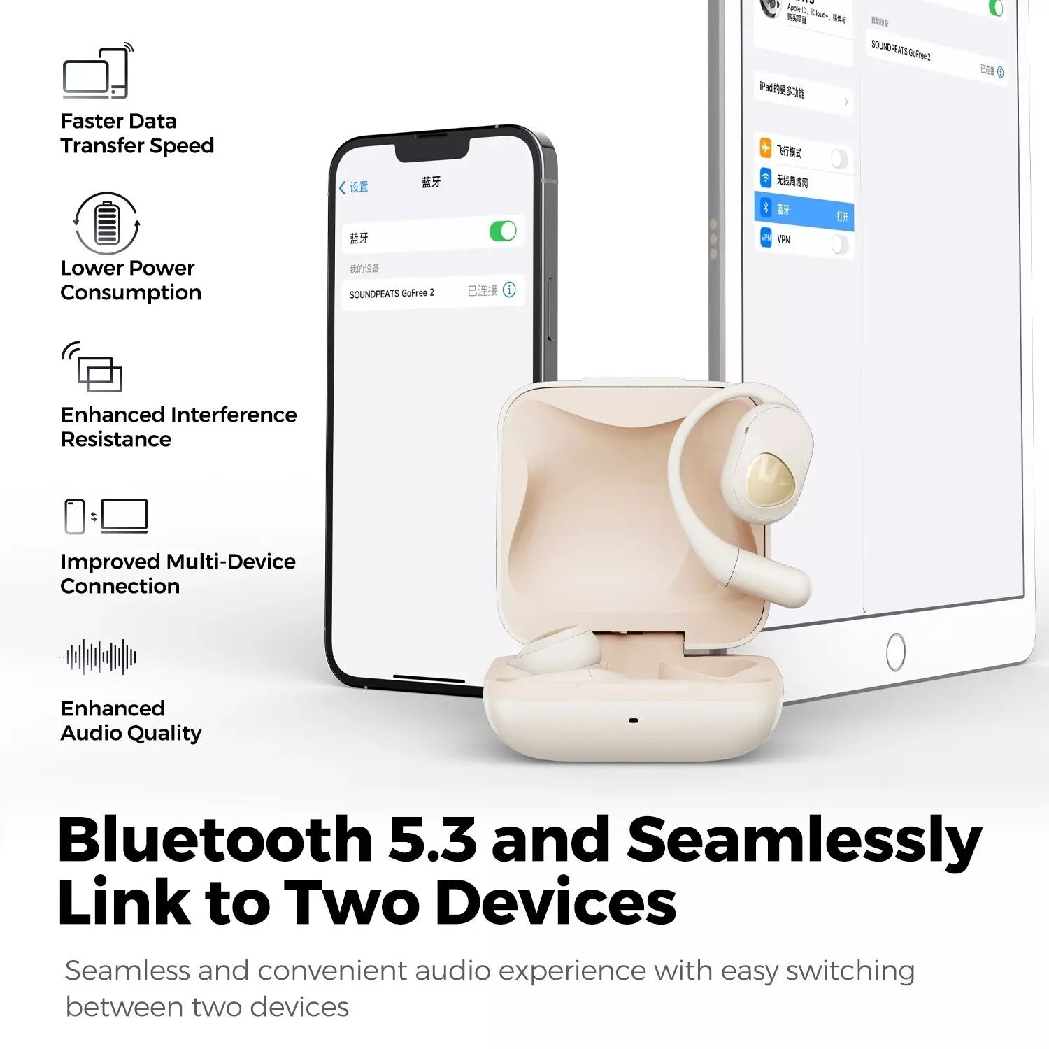 Experience superior sound quality with the SoundPEATS GoFree2+ TWS Wireless Earphones. These ear hooks are designed for comfort and come in a beige color and With Bluetooth connectivity, these earphones have a range of features such as surround sound, wireless charging, touch control, and active noise cancellation. The SoundPEATS GoFree2+ earphones have a rechargeable battery and a push-to-talk (PTT) function. They are sweat-proof and water-resistant, making them perfect for outdoor Sport activities. These earphones also have a built-in microphone, call functions, and volume control. The unit comes with a 0.8m cable length and has a manufacturer warranty of 1 year.